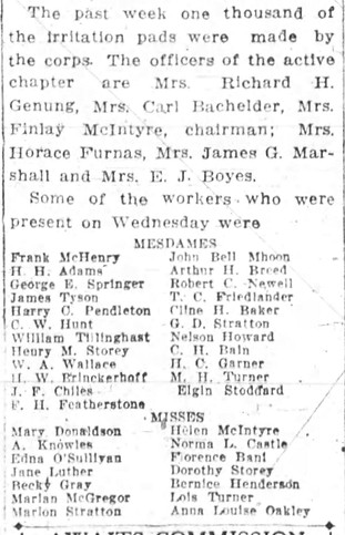 No more splendid record could be achieved than that of a group of matrons who have given their time exclusively to the Red Cross sewing this week. They have averaged 500 face masks per day and a daily attendance of fifty workers at the Piedmont branch of the Red Cross, with headquarters in the Interdenominational church.