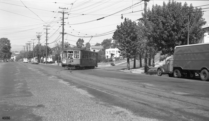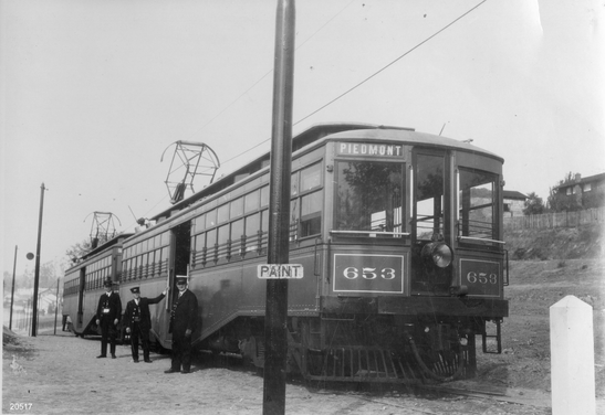 The 3.12-mile Oakland Avenue line originated as a part of Consolidated Piedmont Cable in 1892 and was later electrified. It was standard gauged in 1902 after acquisition by Oakland Transit. As a cable line, this route ascended the steep Oakland Avenue hill and used a long gravity loop on weekends. This was not practical as an electric line, so the route was divided, the steep hill line abandoned, and the lower end diverted via private right-of-way to Piedmont and Linda Avenues, avoiding heavy grades.