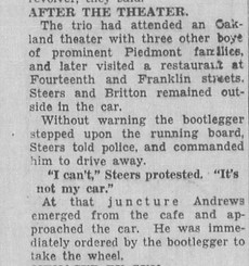 The two above named men drove into an oil station on Grand avenue one morning last week where Officer Barrett of the Piedmont force happened to be, evidently with the intention of inquiring directions to some residence. Upon sighting the policeman instead of waiting for the answer to their inquiries the pair drove hurriedly off, with the suspicious Barrett following close behind.